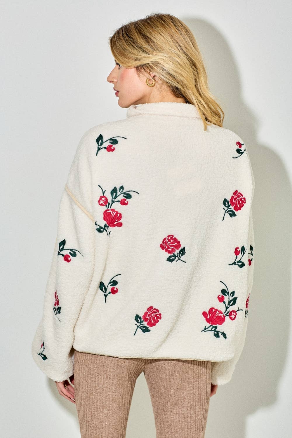 Cozy meets chic in the Rosewood Sherpa Jacket—a dreamy blend of western charm and everyday comfort. Crafted from ultra-soft cream sherpa, this oversized zip-up is scattered with embroidered red roses for a feminine, standout look. The relaxed fit, drop shoulders, and roomy front pockets make it the perfect throw-on layer for chilly days, whether you’re headed to brunch, strolling downtown, or cozying up fireside.