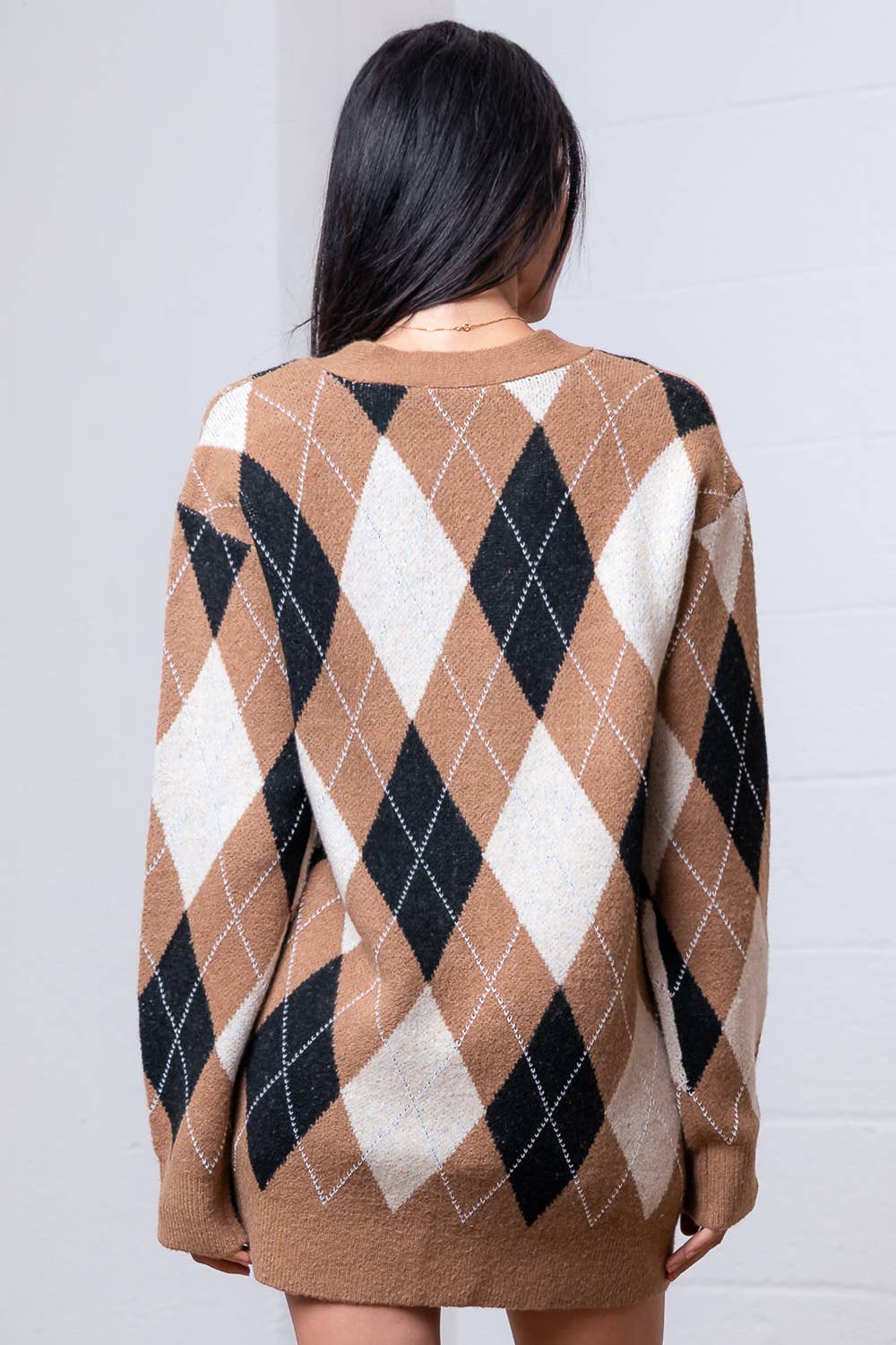 Cozy meets classic with the Quinn. This oversized cardigan brings a timeless argyle pattern in warm camel, cream, and black tones—perfect for layering from fall’s first chill to winter’s last frost. The button-front design and relaxed fit make it effortless to throw over denim and boots for a casual ranch day or over a dress for a polished, preppy twist. Soft knit fabric keeps it comfortable while the bold diamond pattern adds vintage-inspired charm.