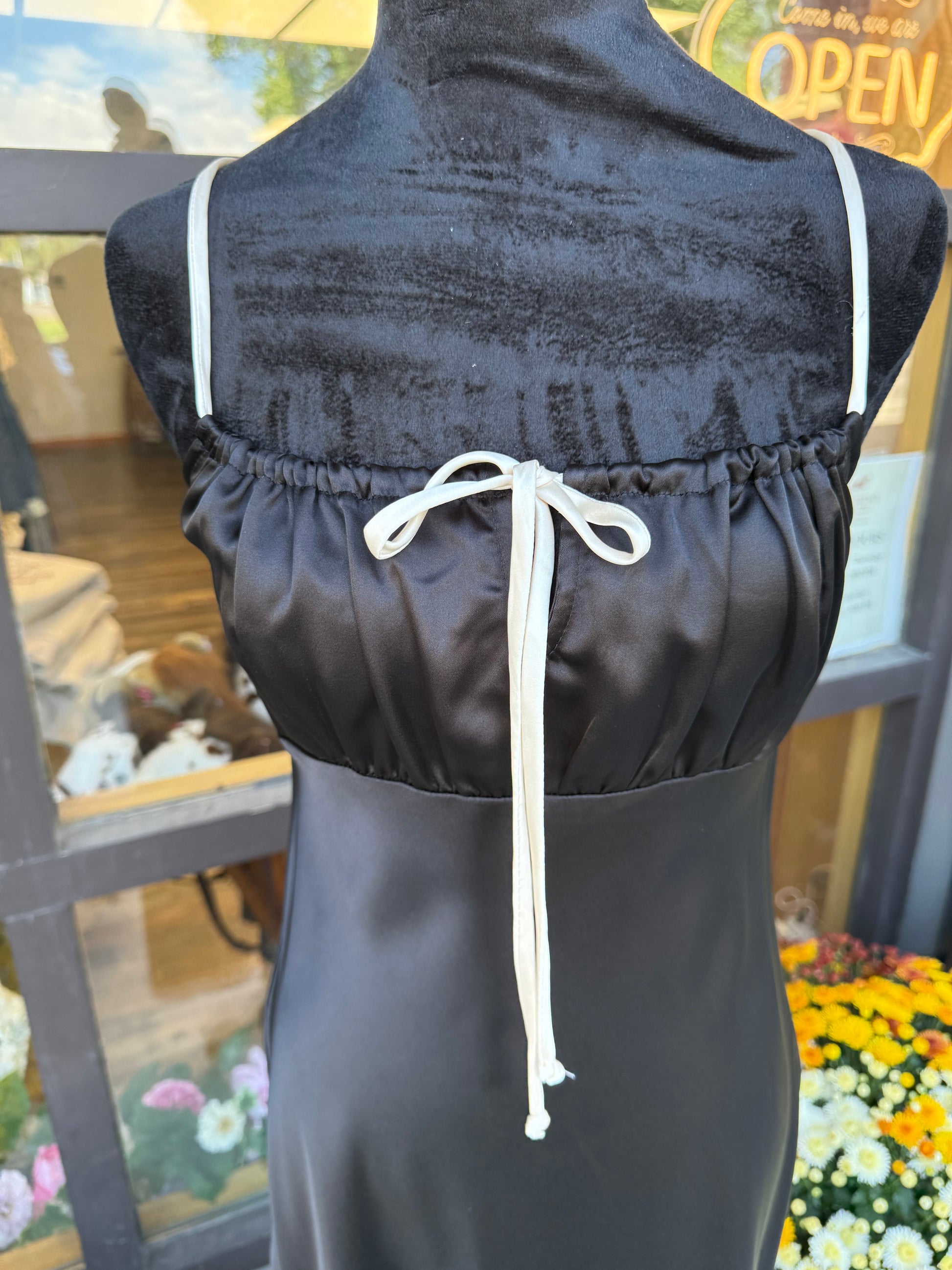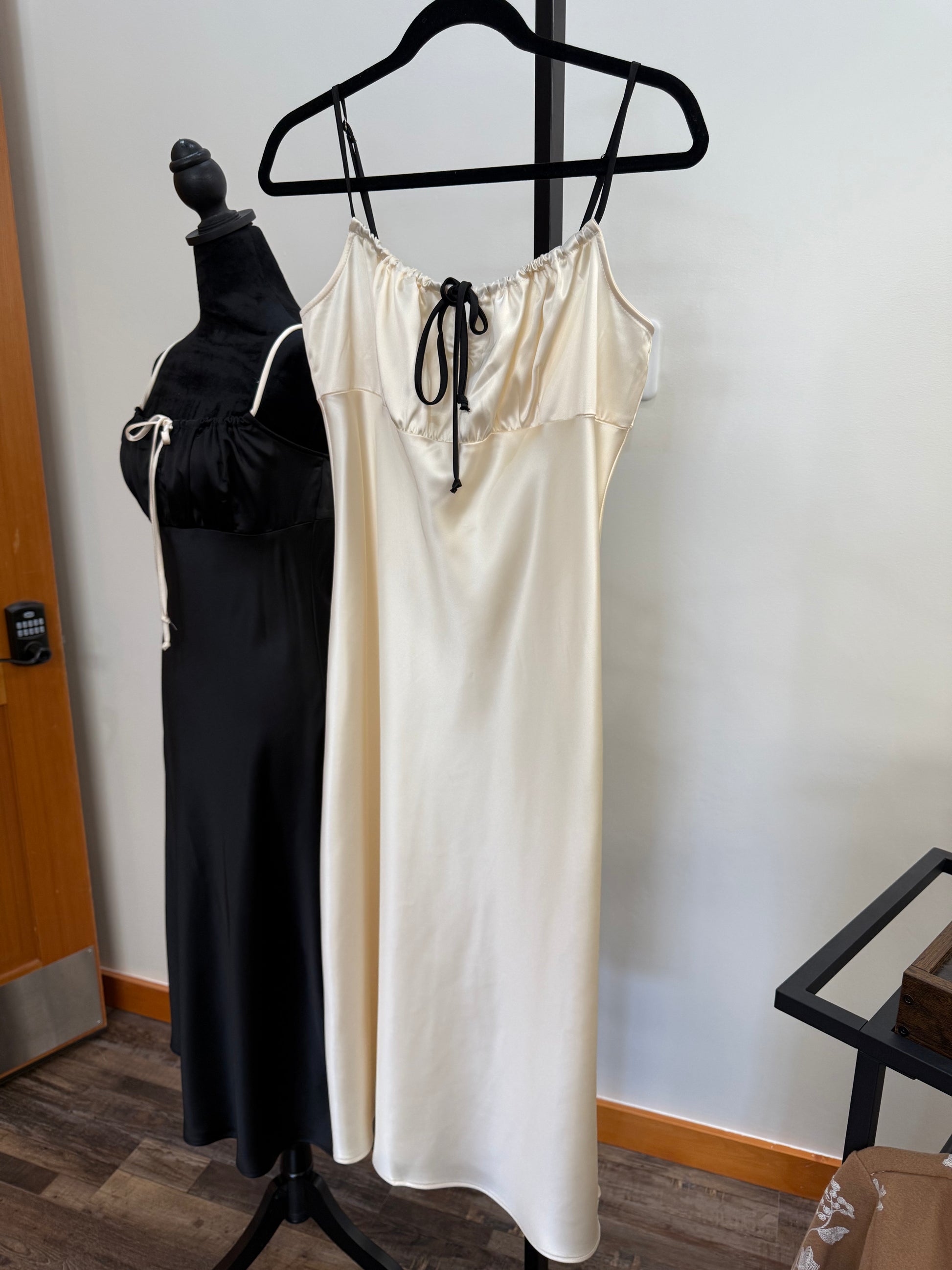 Elegant and versatile, the Juliet Tie-Front Midi Dress is designed with a flattering empire waist and feminine details that make it a standout piece. Crafted from a drapey mid-weight polyester spandex satin, it skims the body with just the right amount of sheen. The adjustable contrast spaghetti straps and center front keyhole with tie closure add delicate charm, while subtle shirring at the bodice enhances the fit. Available in classic black for timeless sophistication or cream for soft, romantic appeal, this midi transitions seamlessly from day to night.