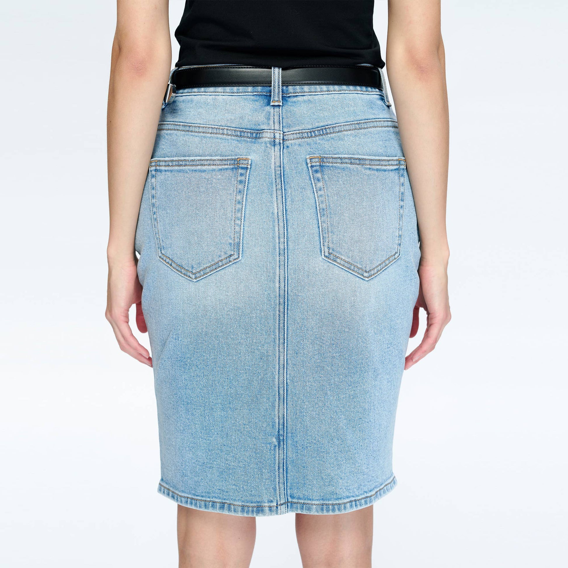 A timeless denim pencil skirt designed for the modern cowgirl. Crafted from comfort-stretch denim in a medium cobalt blue wash, this skirt blends structure with just the right amount of give. Featuring classic five-pocket styling, subtle grinding at the pocket openings, and whisker detailing for that naturally worn-in look. The front slit adds both ease of movement and a hint of edge, while the finished hem keeps it polished. Pair with boots, sandals, or heels for a versatile western-inspired staple.
